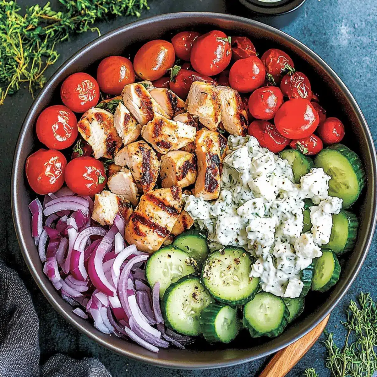 - Divide the cooked chicken among serving bowls. Top each portion with diced cucumber, halved cherry tomatoes, sliced red onion, and Kalamata olives. Sprinkle crumbled feta cheese and drizzle with the dressing.