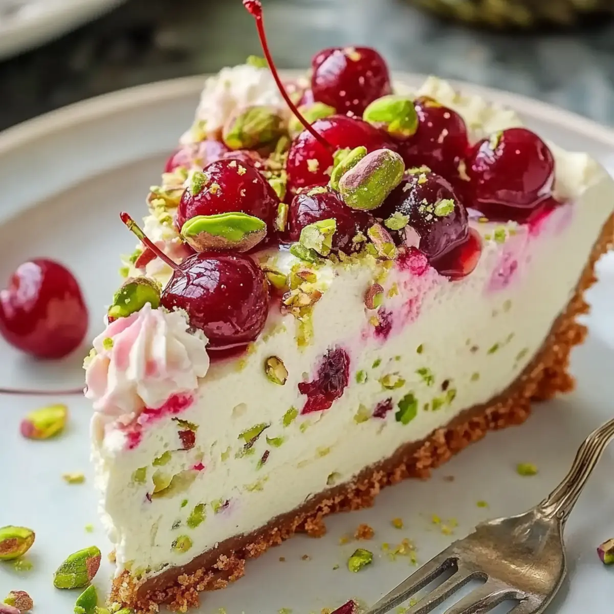 Gently fold in the sweet cherries and chopped, lightly toasted pistachios into the cheesecake mixture. Use a spatula to ensure even distribution without overmixing, as this helps maintain a luscious creamy texture. The vibrant colors and textures will make your cheesecake even more appealing and will create a delightful flavor burst.