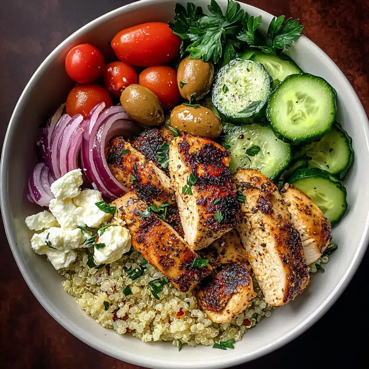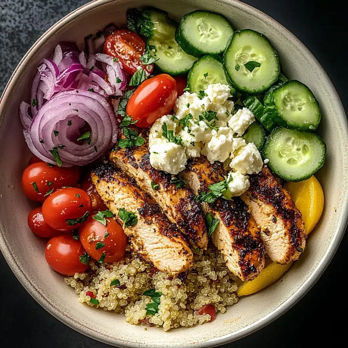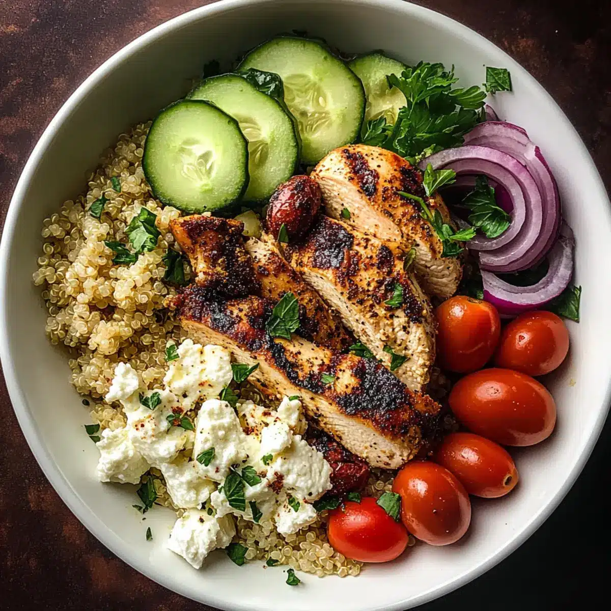 In serving bowls, spoon a generous portion of warm quinoa as the base. Next, slice the grilled chicken and arrange it on top, surrounded by diced cherry tomatoes, cucumber slices, red onion, kalamata olives, and crumbled feta cheese. The explosion of colors will make your Mediterranean Chicken Bowl visually delightful!