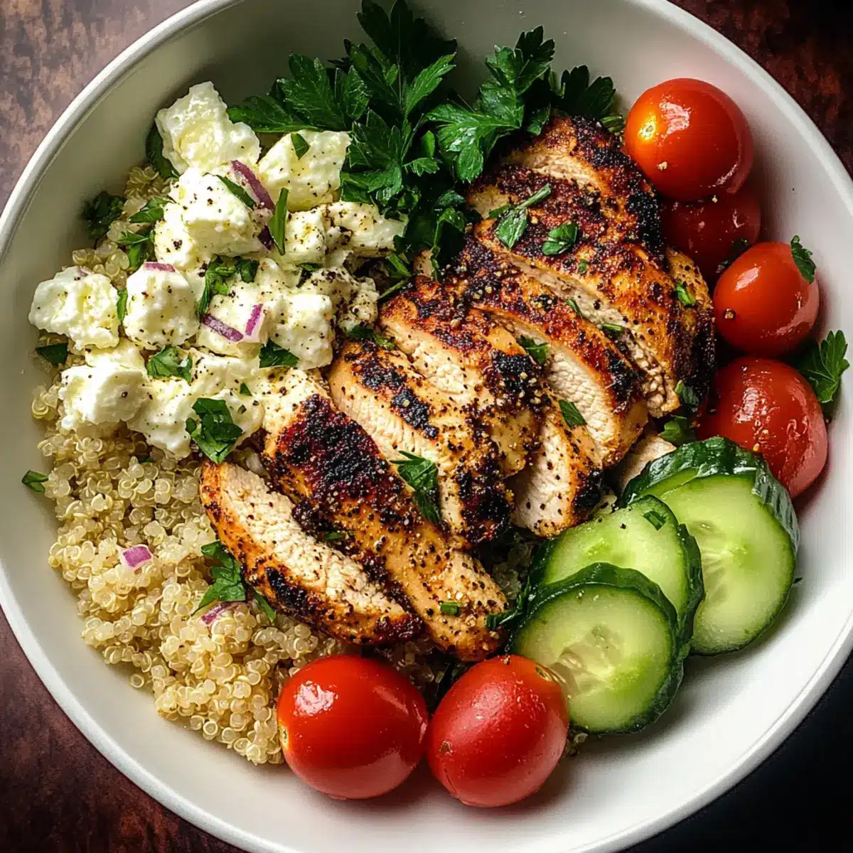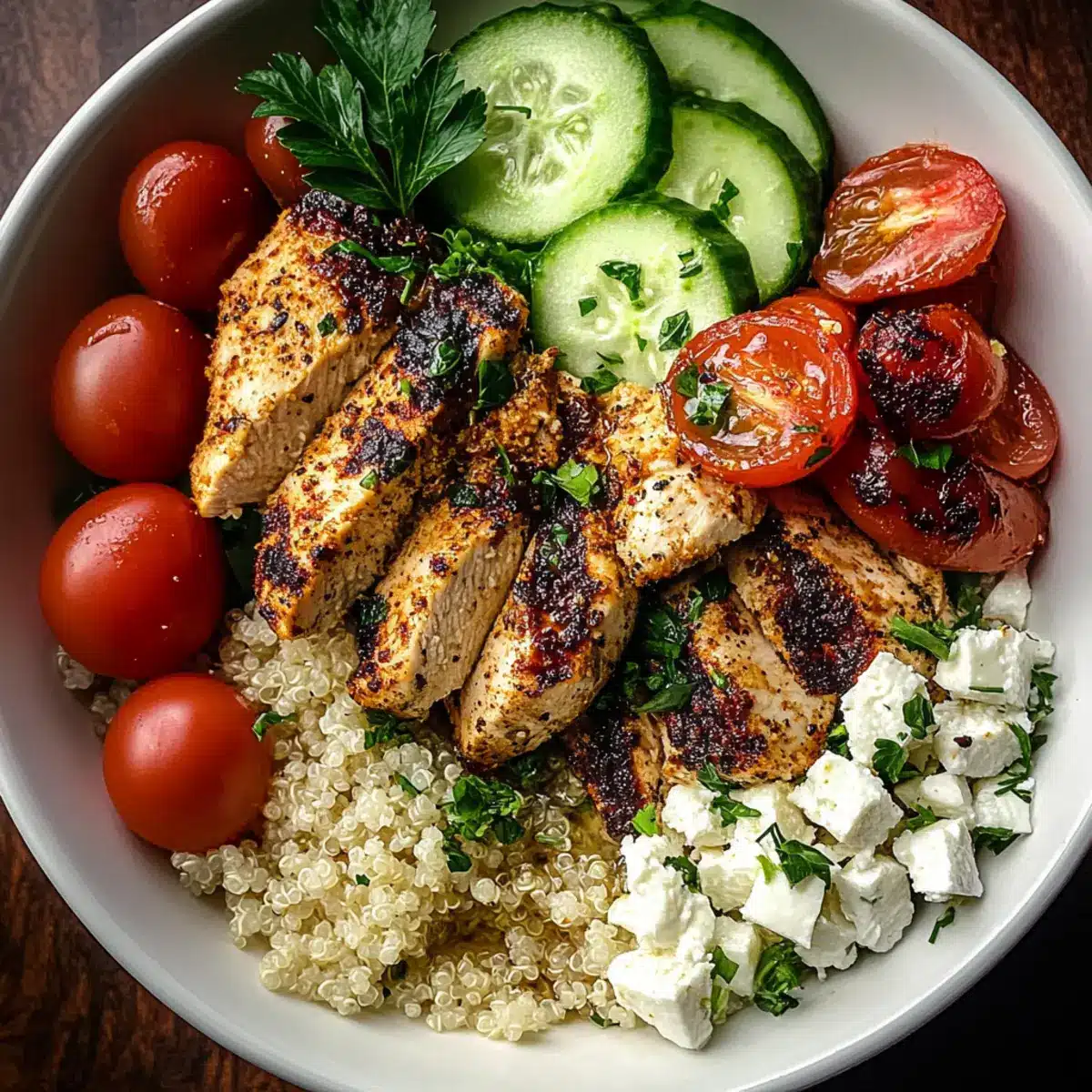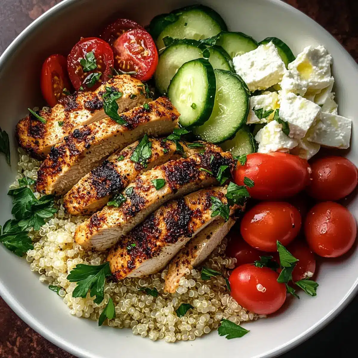 - Assemble the bowl with quinoa as the base, topped with sliced chicken, cherry tomatoes, cucumber, red onion, Kalamata olives, and feta.