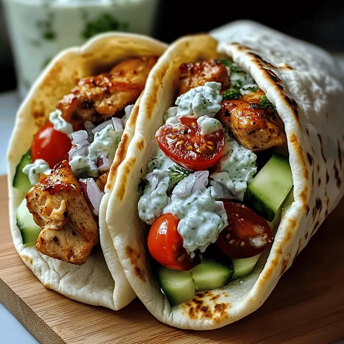Once the chicken is cooked, remove it from the skillet and allow it to rest for a couple of minutes before slicing it into thin strips. To assemble your Mediterranean Chicken Gyros, place warm pita bread on a plate, spread a generous amount of creamy feta tzatziki over it, followed by the chicken slices. Top with cherry tomatoes, cucumber, and red onion for a fresh and vibrant finish. Roll tightly and serve immediately.
