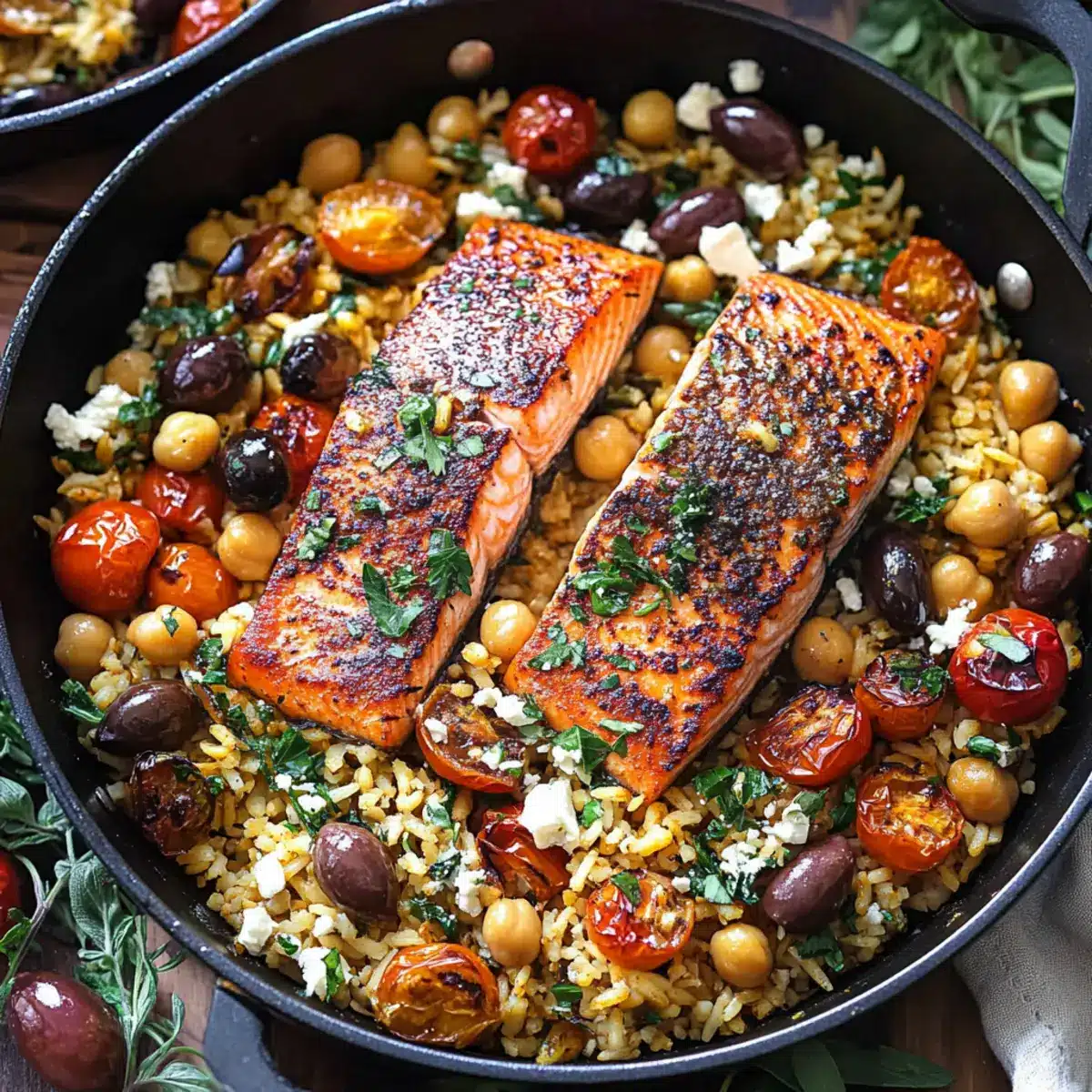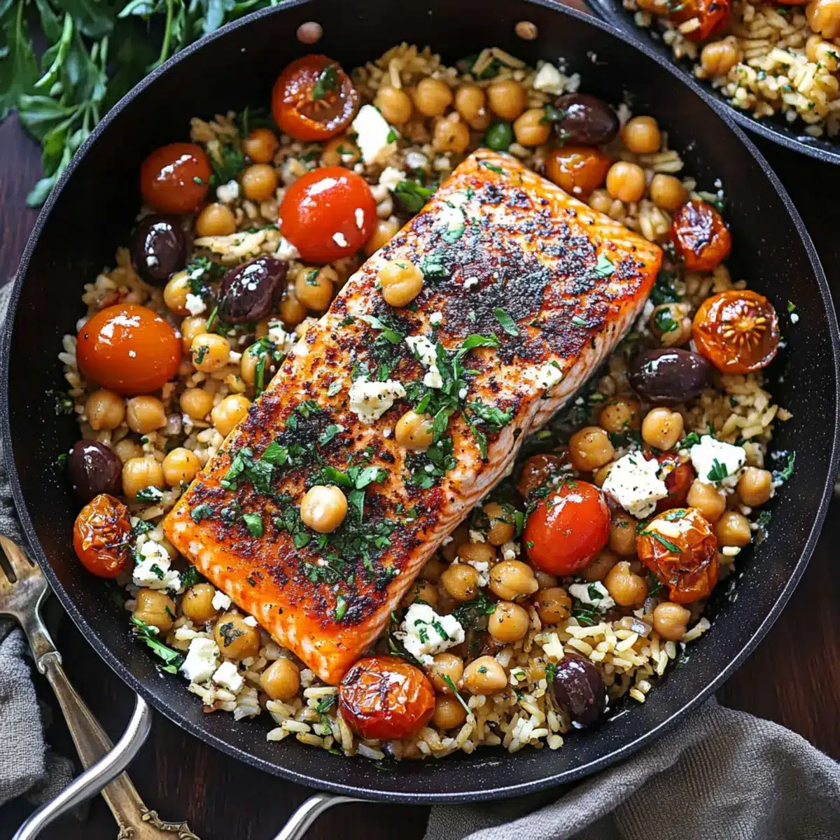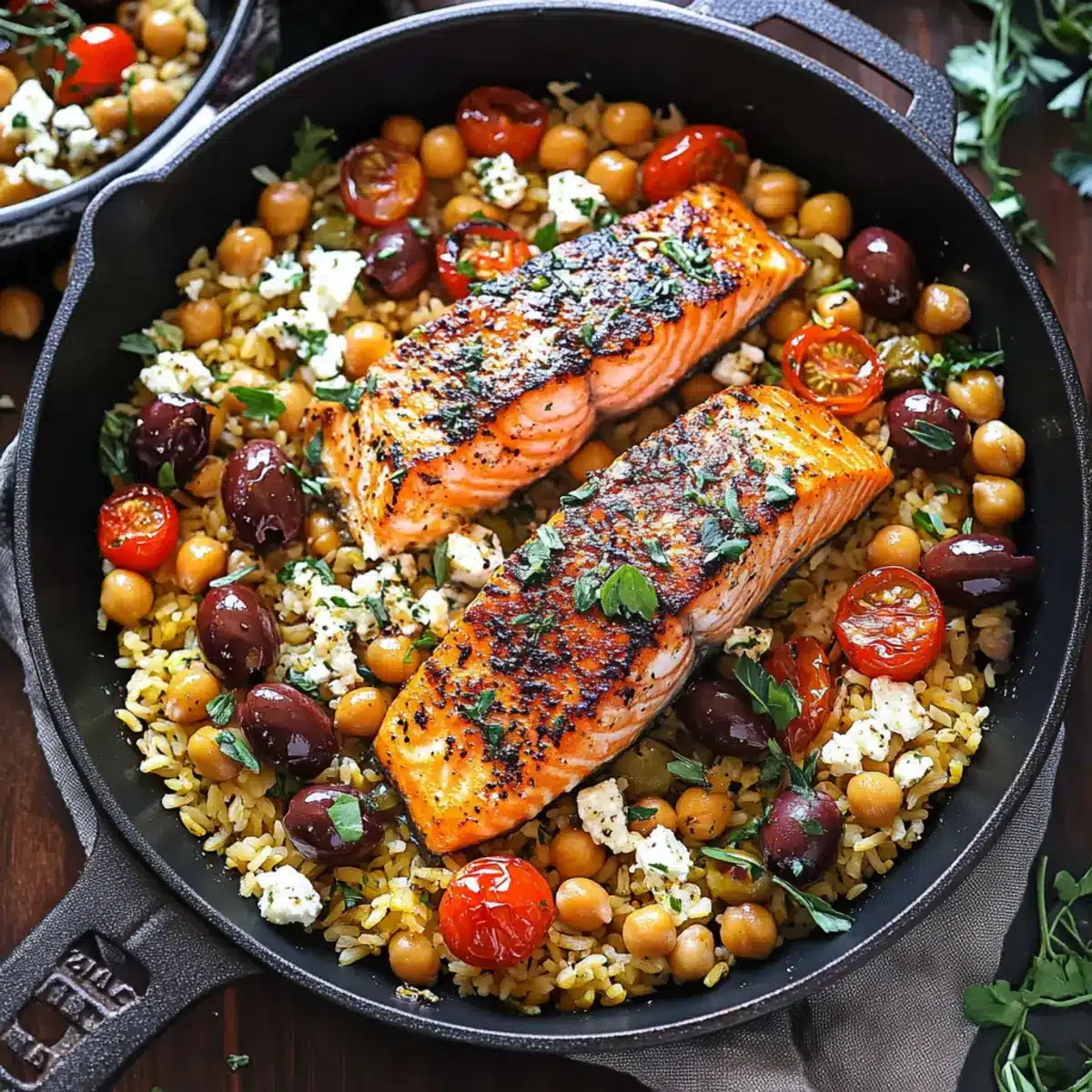 These Mediterranean Salmon dishes are perfect for meal prep enthusiasts! You can season and refrigerate your salmon fillets up to 24 hours in advance, allowing the flavors to meld beautifully. Feel free to prepare the chickpeas and rice mixture, combining them, along with the olives and tomato, in an airtight container, which can be stored in the fridge for up to 3 days. When you’re ready to serve, simply reheat the base in a skillet while cooking the salmon for about 5 minutes, then top with the creamy feta mixture. This make-ahead strategy guarantees delicious, fresh-tasting results with minimal effort, making weeknight dinners a breeze!