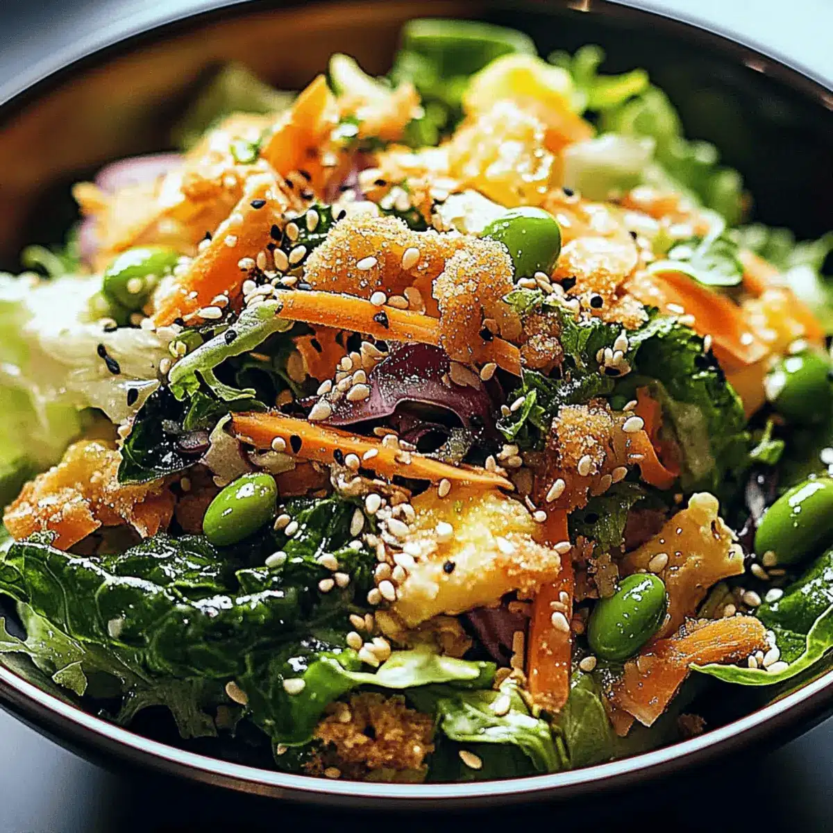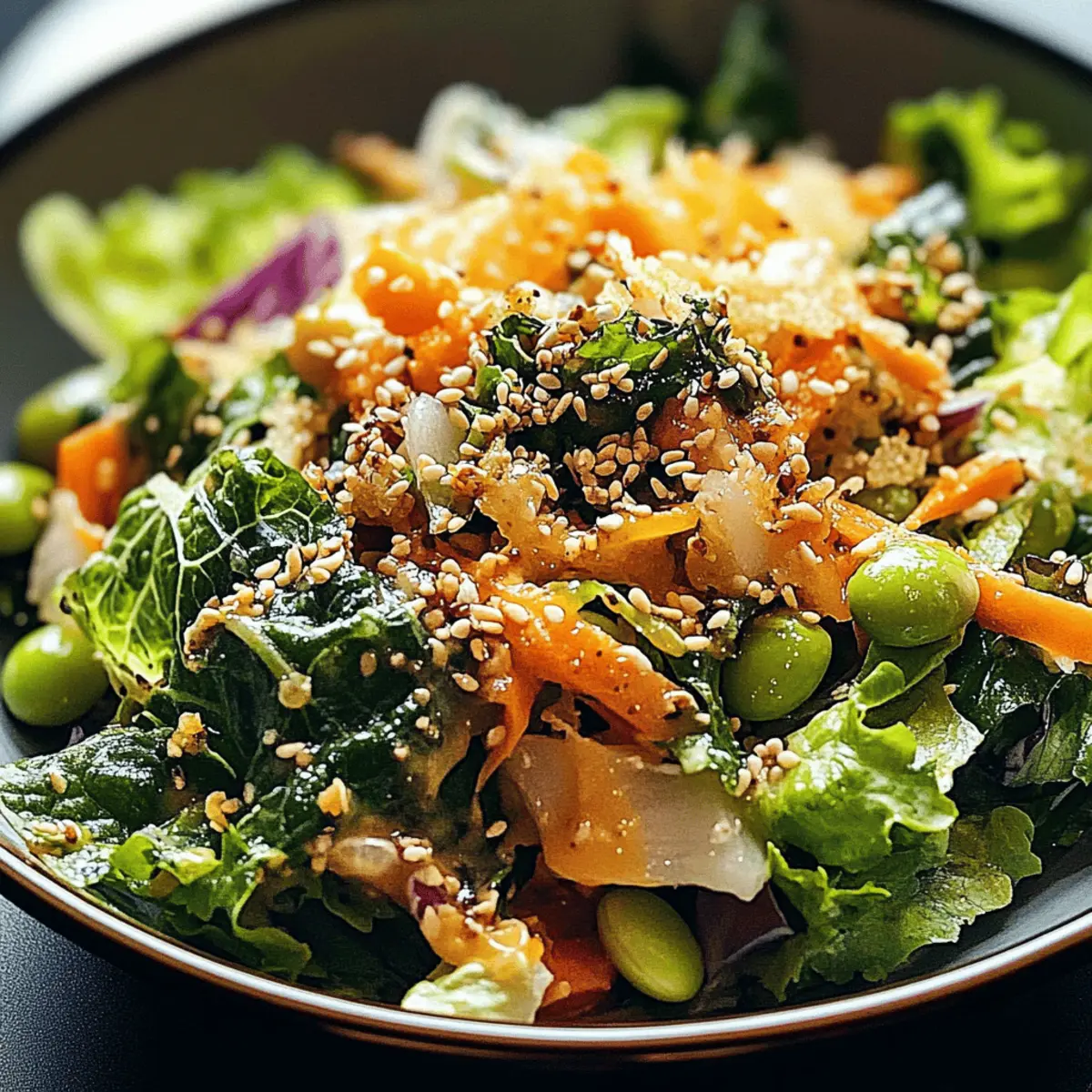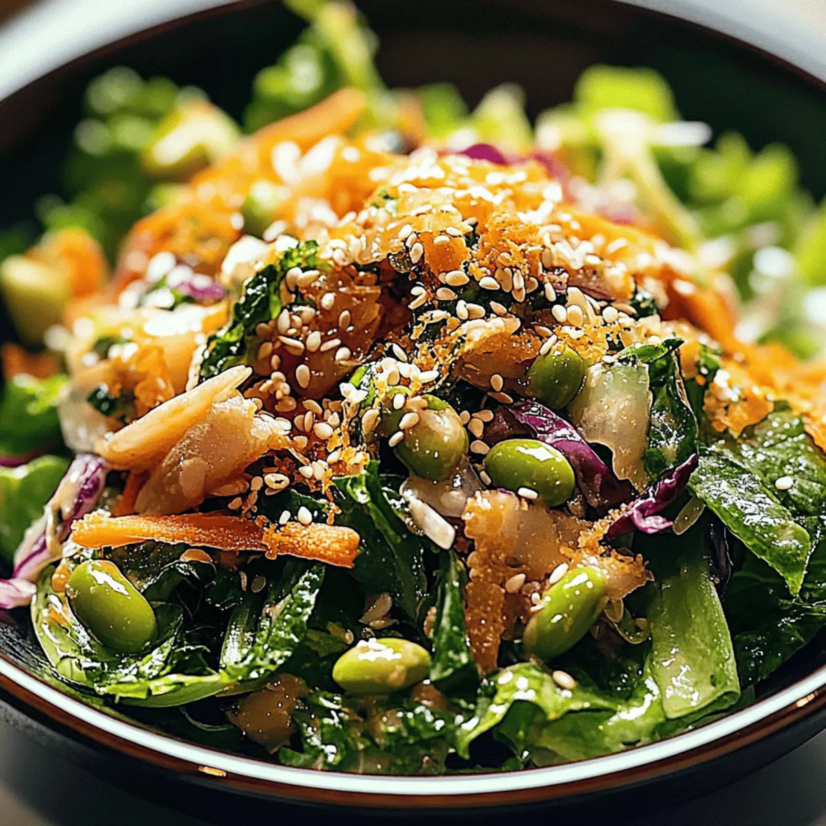 In a large mixing bowl, combine 4 cups of chopped romaine lettuce, 1 cup of shredded red cabbage, and 1 cup of shredded carrots. Add 1 cup of shelled edamame, chopped green onions, and fresh cilantro to elevate the freshness and color. Toss gently to mix all the vibrant ingredients evenly, ensuring each component is well-distributed for your Miso Crunch Salad.