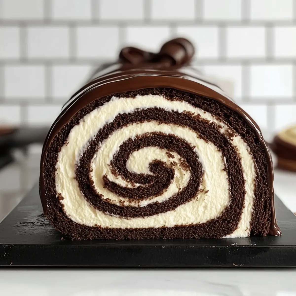 Once chilled and set, unwrap the Swiss roll and carefully place it on a serving platter. Drizzle the cooled chocolate sauce generously over the top and cut into slices. Each piece should reveal the beautiful swirls of chocolate cake and creamy filling, perfect for impressing your guests!