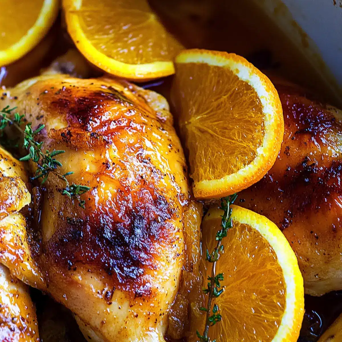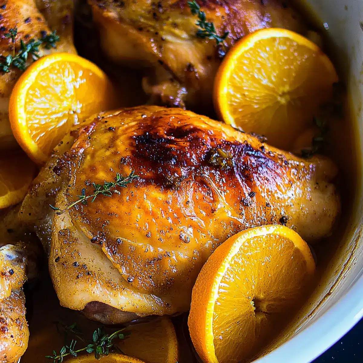 - Return the chicken skin-side up, adding sliced orange, red pepper flakes, thyme, and purple onion on top.