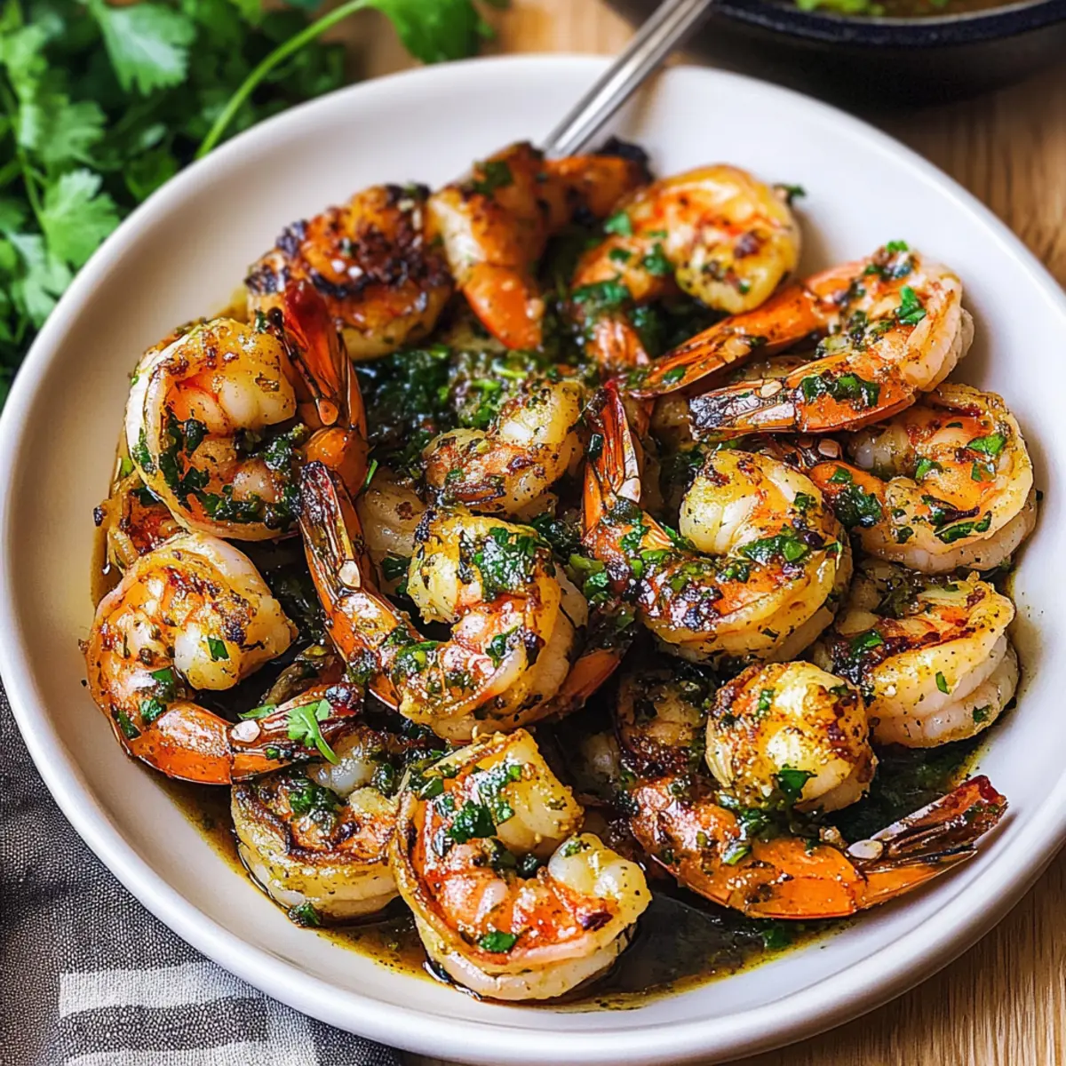 - Transfer cooked shrimp to a serving dish, spoon chimichurri over, and serve with additional sauce and crusty bread.
