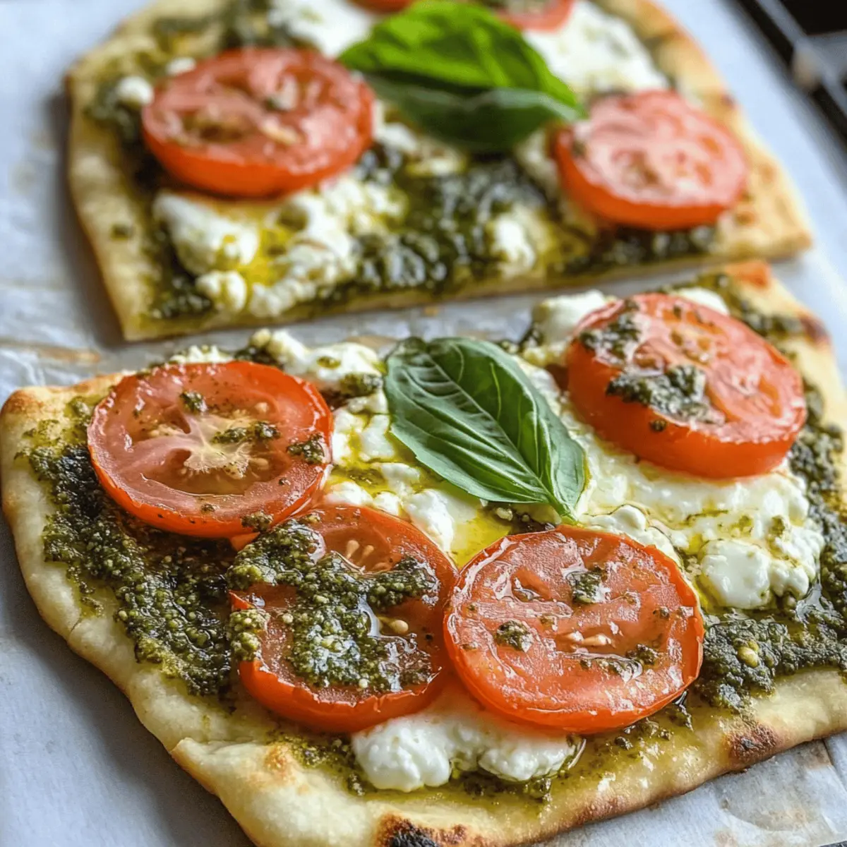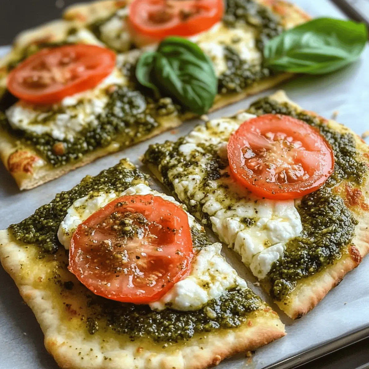 These Pesto Flatbread Pizzas are perfect for meal prep, allowing you to enjoy a homemade dish with minimal effort! You can assemble the pizzas up to 24 hours in advance by spreading the ricotta and mozzarella, adding the garlic, salt, and pepper, and drizzling the pesto over the top. Simply cover them with plastic wrap and refrigerate. When you’re ready to enjoy your homemade pizza, just slice the Roma tomatoes and layer them on top before baking as per the recipe instructions. This approach not only saves time but ensures the flavors meld beautifully, making your Pesto Flatbread Pizza just as delicious when finished.