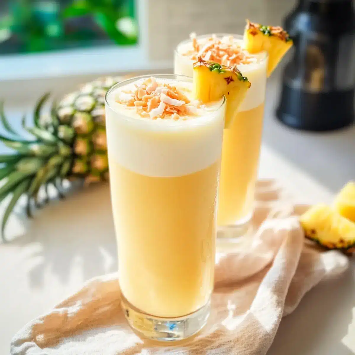 - Pour into glasses, garnishing with coconut flakes or fresh pineapple.