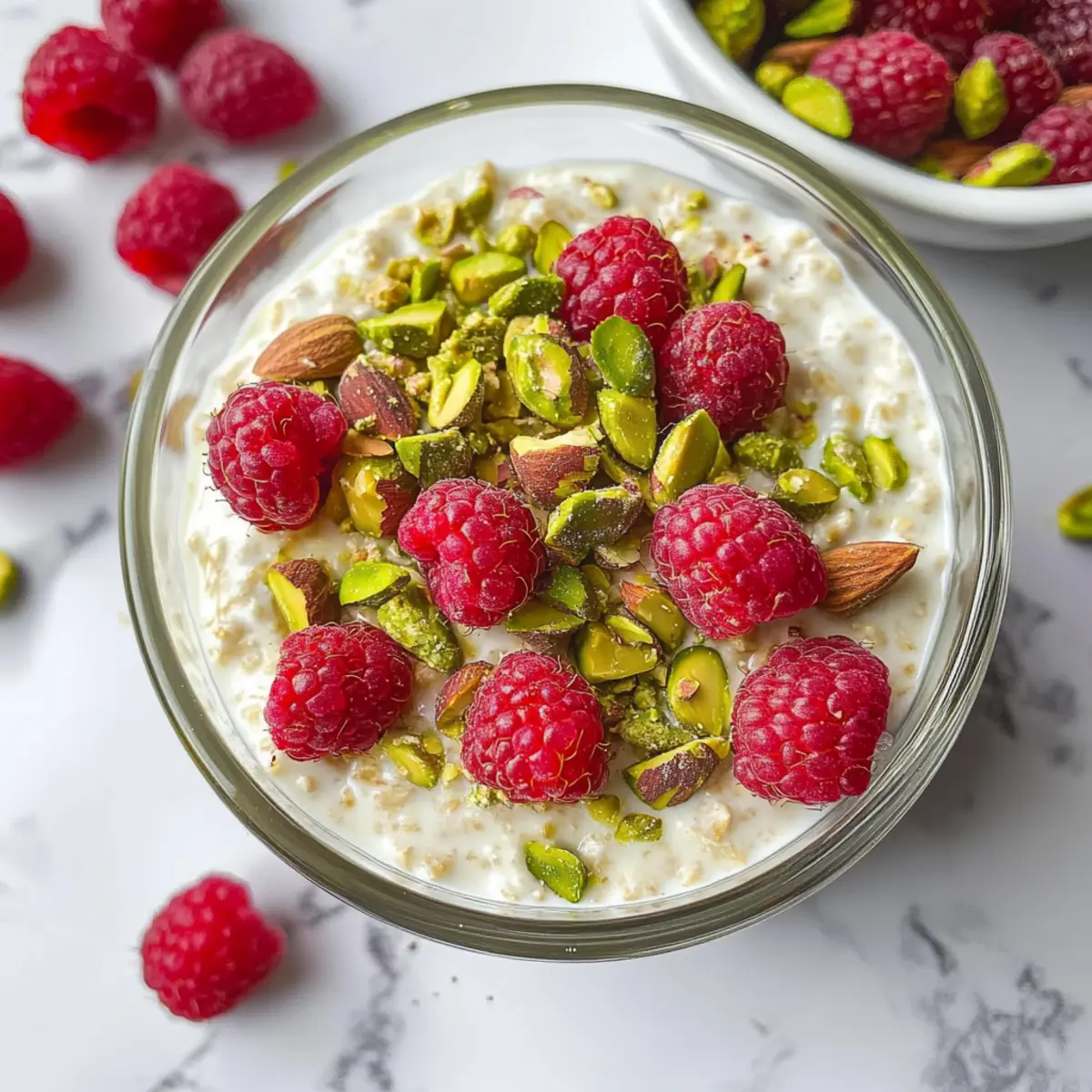 - In the morning, stir and top with yogurt, raspberries, and chopped pistachios.