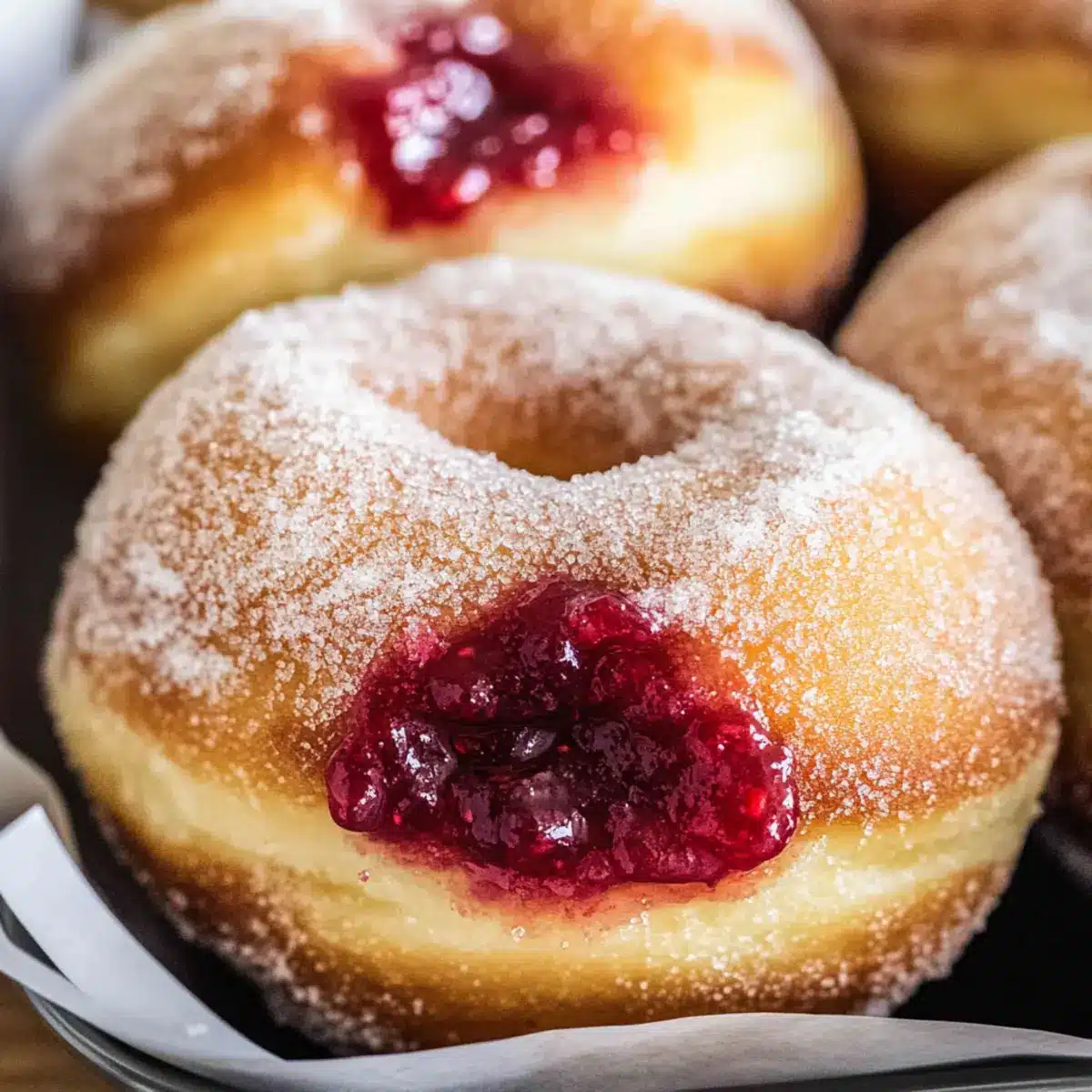 - Toss the cooled doughnuts in superfine sugar and fill each doughnut with the cooled raspberry jam.