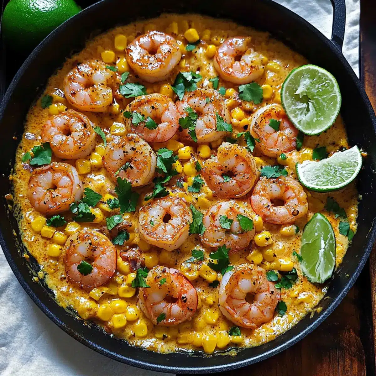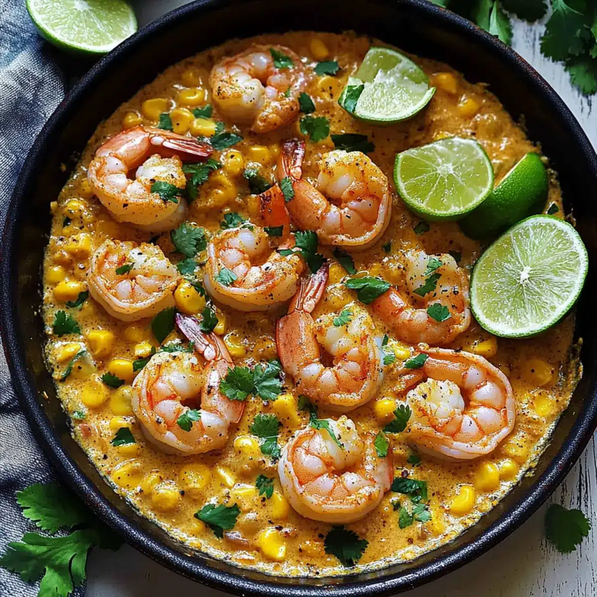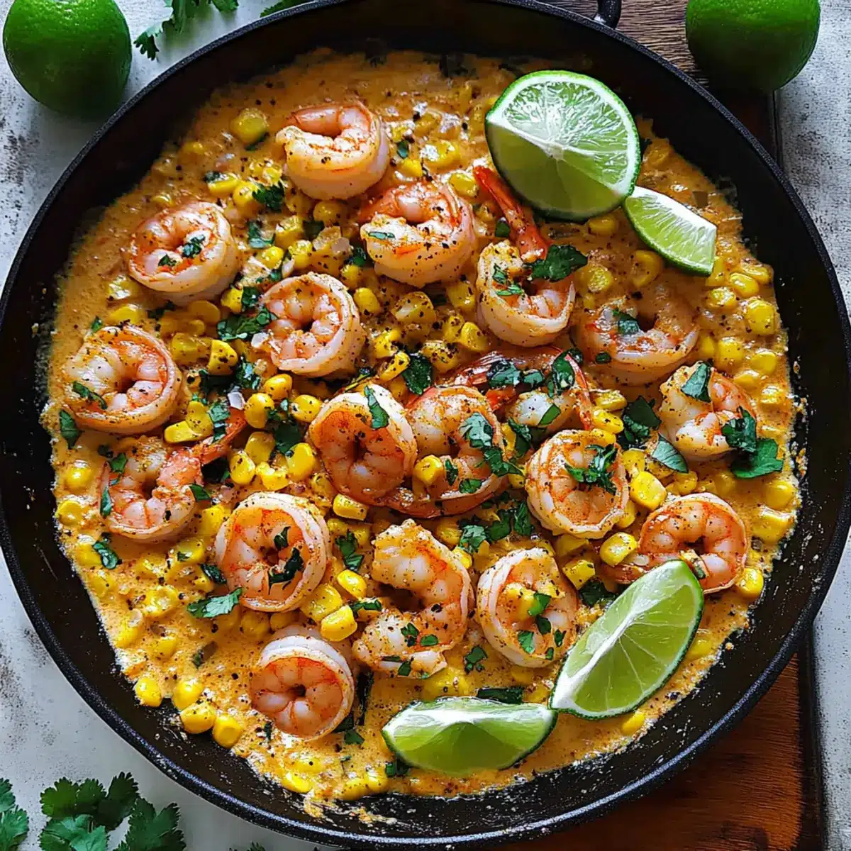 Finally, squeeze the juice of 2 small limes into the sauce for a burst of freshness. Return the cooked shrimp to the skillet, gently stirring to coat them in the creamy sauce. Heat everything together for about 1-2 minutes until the shrimp are warmed through. For an extra touch, top the dish with the remaining corn and garnish with fresh cilantro before serving warm.