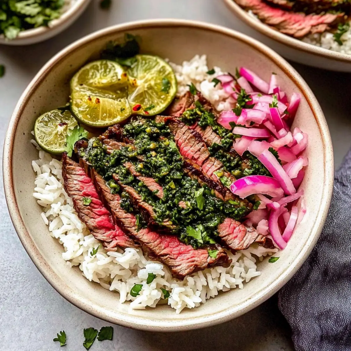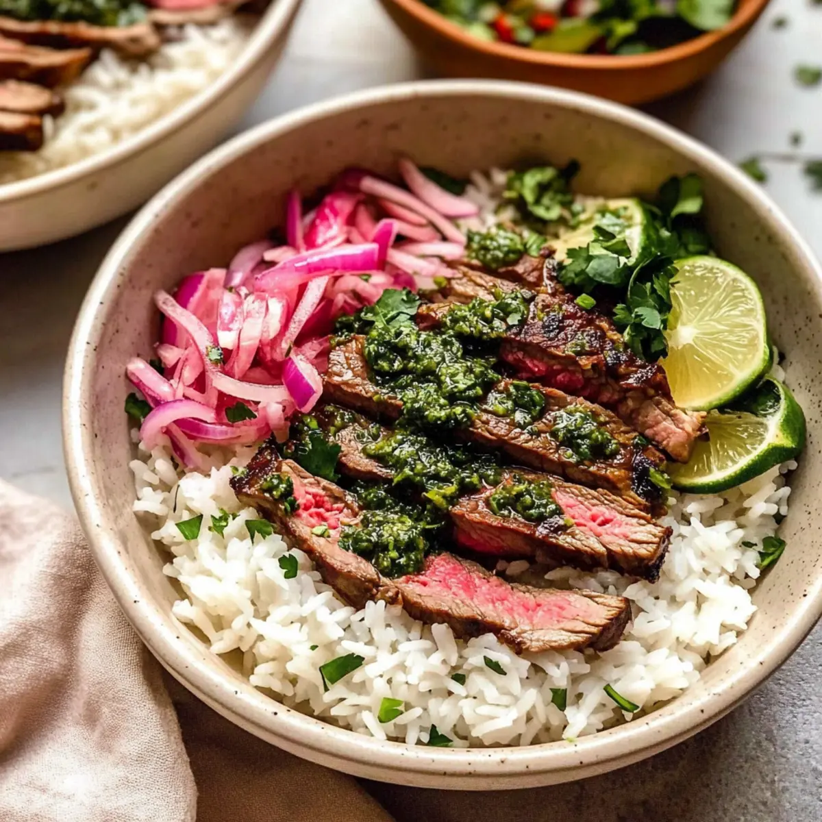 - Assemble bowls with rice, sliced steak, chimichurri, and optional toppings.