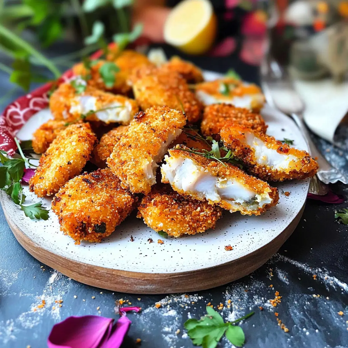 While the fish is marinating, prepare the coating by mixing panko breadcrumbs, all-purpose flour, and dried parsley in a separate bowl. This combination provides a crunchy texture that makes your spicy fish nuggets irresistible. Set this mixture aside for later, while you move to the next step.