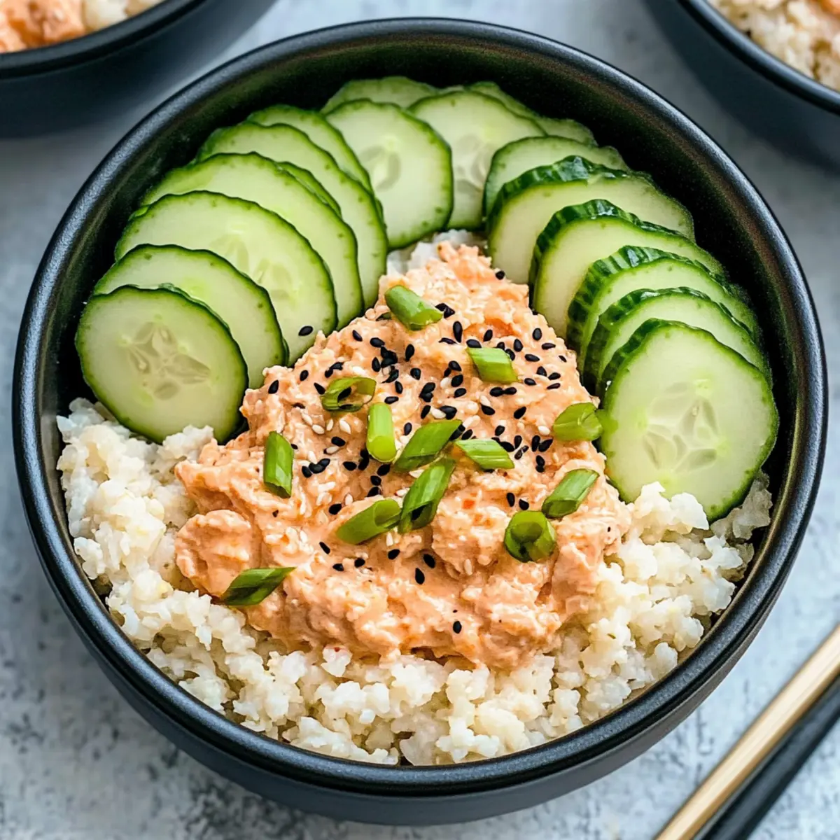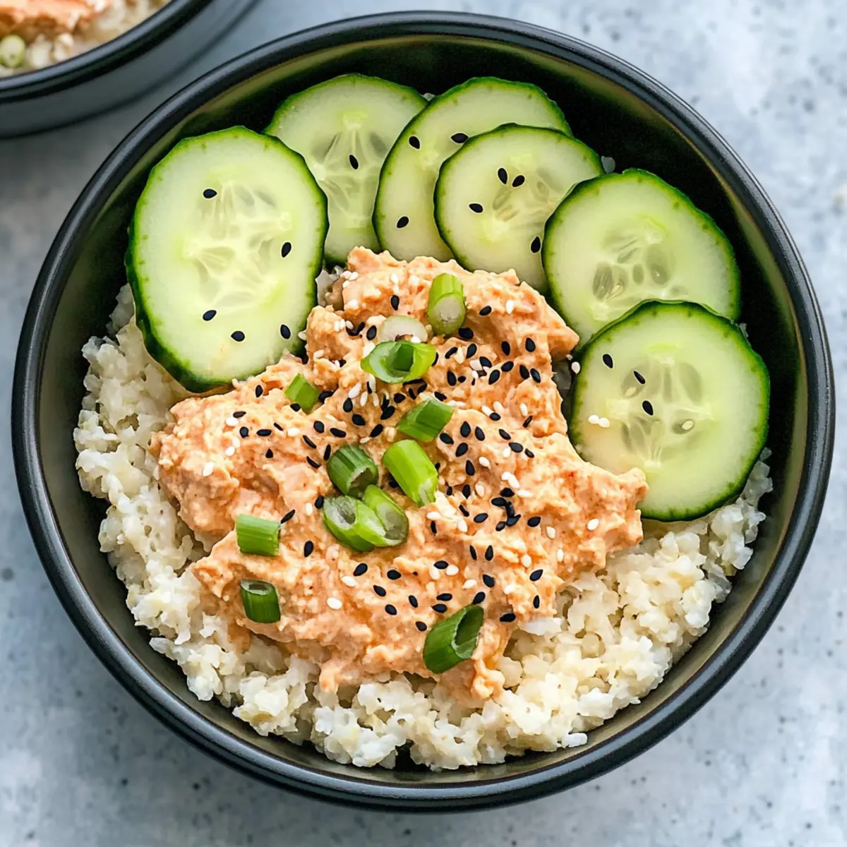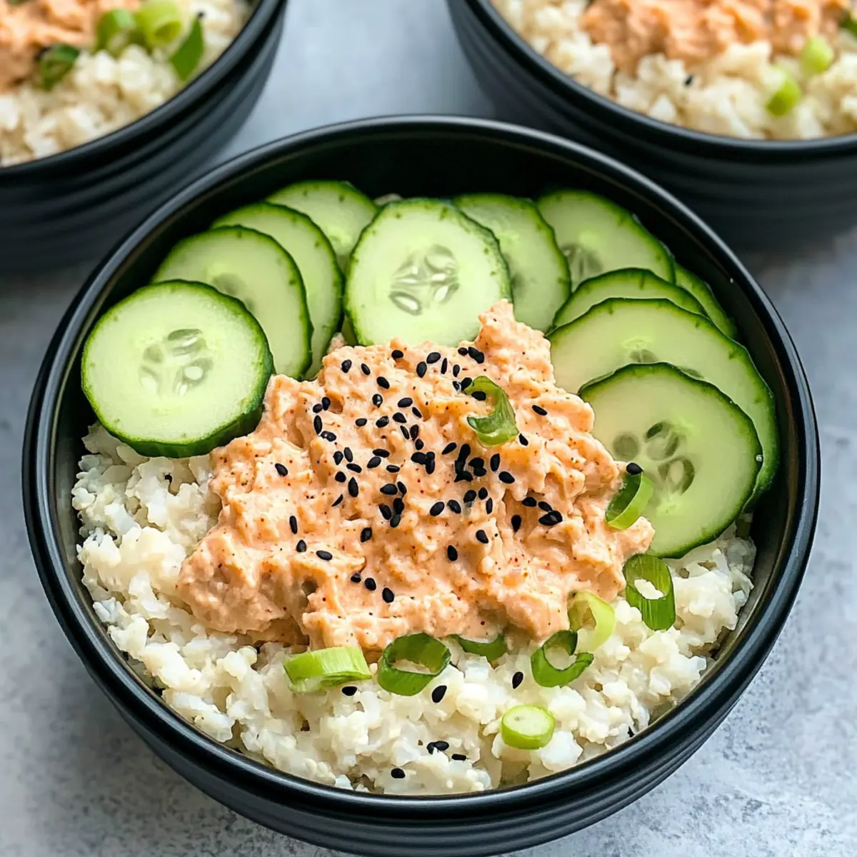 - Divide the spicy tuna mixture over the cauliflower rice in each container. Add sliced cucumber, followed by black and white sesame seeds and scallions on top.