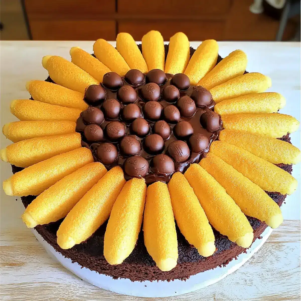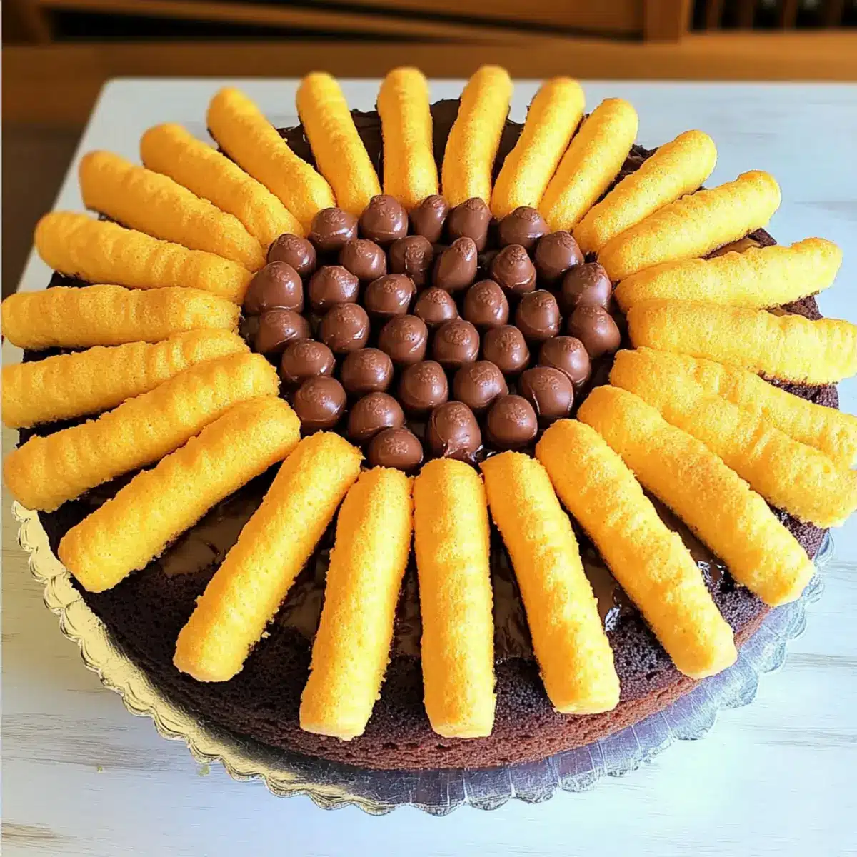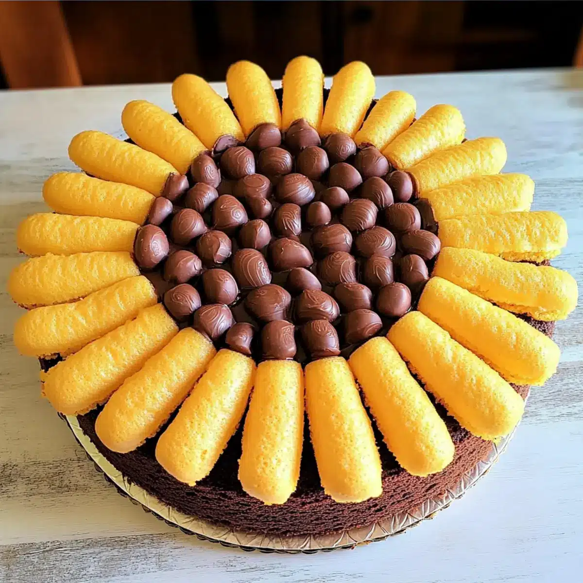 Gently scatter Hershey’s kisses over the frosted top of the cake, creating a central spot that resembles the heart of a sunflower. Arrange them closely together for a fuller appearance, providing a rich, chocolatey center that complements the moist chocolate cake well. This step adds visual appeal and a delightful surprise in every slice.
