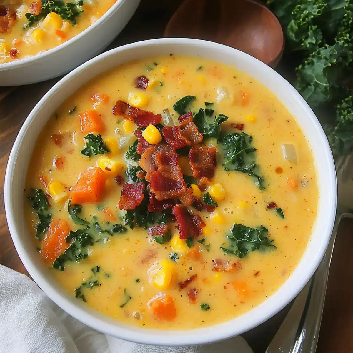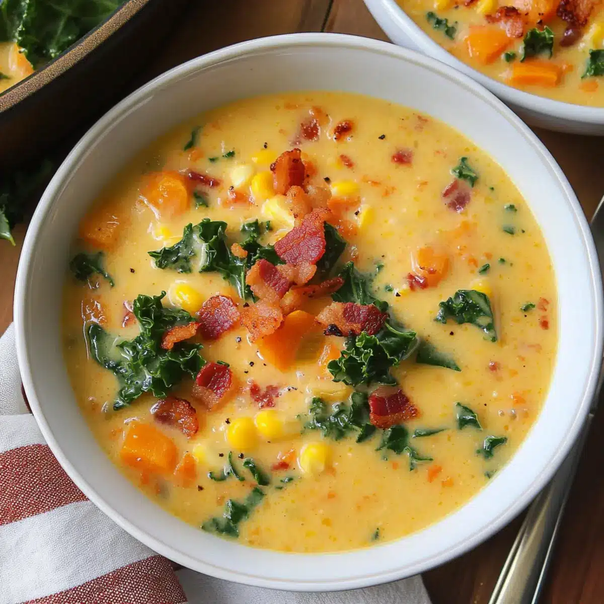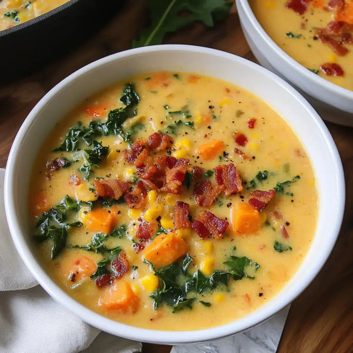 As I stood on my patio, a gentle breeze carried the enticing aroma of roasted sweet potatoes and smoky bacon wafting through the air, instantly transporting me to comfort food heaven. This Creamy Sweet Potato Corn Chowder is exactly what you need for those chilly evenings when you crave something warm and nurturing. With its delightful mix of flaky bacon, vibrant kale, and naturally sweet corn, this chowder is not only a crowd-pleaser but also comes together in just one pot — perfect for busy weeknights! Plus, it’s easily adaptable for a vegetarian or gluten-free version to accommodate everyone at your table. Curious about how to whip up this heartwarming dish that wraps you in a cozy hug with every spoonful? Let’s dive into the recipe!