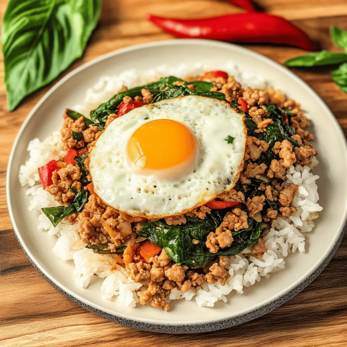 To serve, create a generous bed of jasmine rice on each plate, topped with the flavorful Thai Basil Chicken Stir Fry. For an extra touch, fry a large egg in the same pan until the edges are crispy. Place the fried egg on top of the stir fry, and accompany the dish with any additional fresh vegetables you have on hand for a beautiful and nutritious presentation.