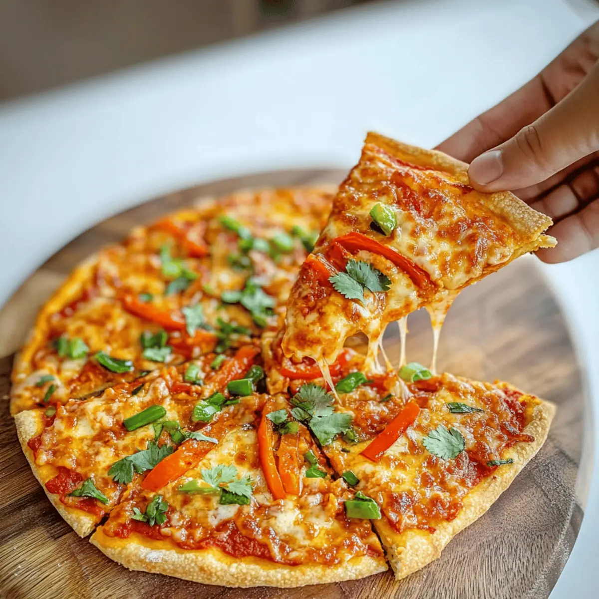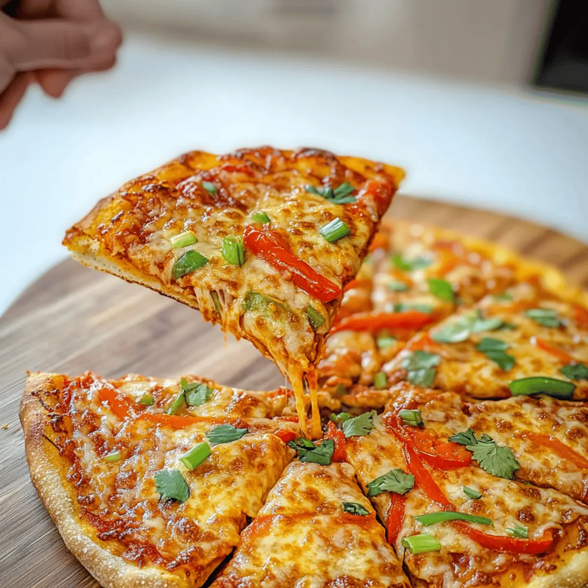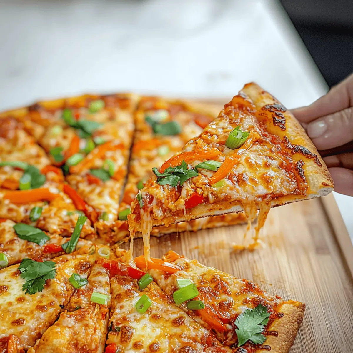Once baked, remove your Thai Curry Pizza from the oven and allow it to cool for a few minutes on the countertop. This cooling period will make slicing a breeze! Finally, garnish with fresh cilantro and sliced green onions, adding a burst of color and flavor just before serving. Dive into this unique pizza experience!