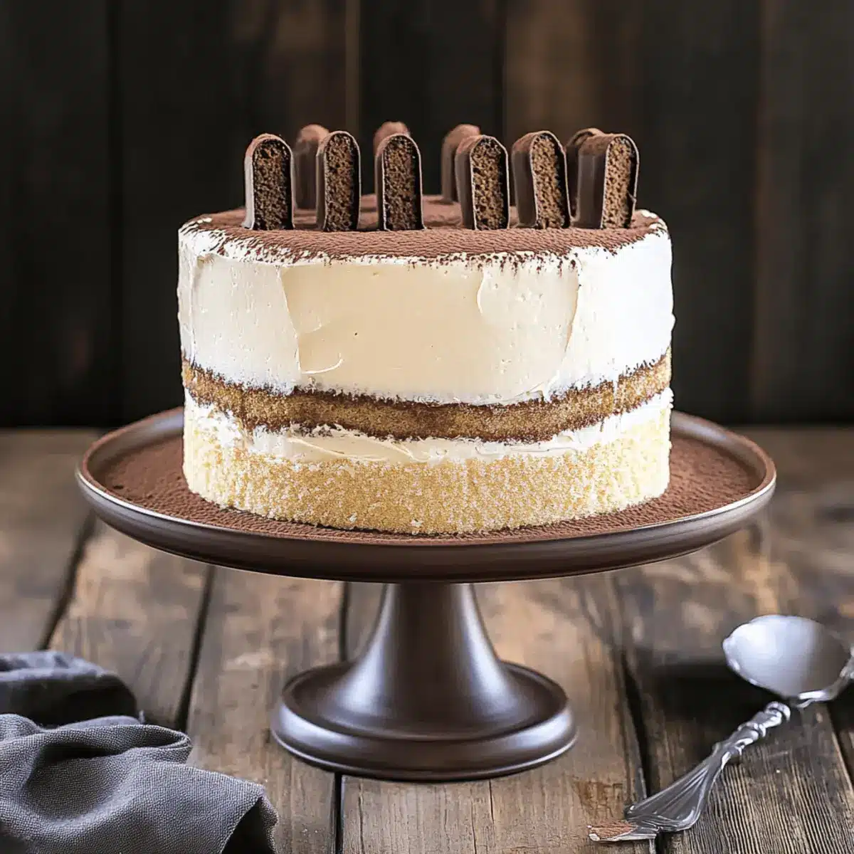 Once all layers are stacked, apply a crumb coat of mascarpone frosting around the sides and top of the Tiramisu Cake. Chill the assembled cake in the refrigerator for about 30 minutes to set. After chilling, frost the entire exterior smoothly with the remaining mascarpone and decorate with sifted cocoa powder or chocolate shavings for a beautiful finish.