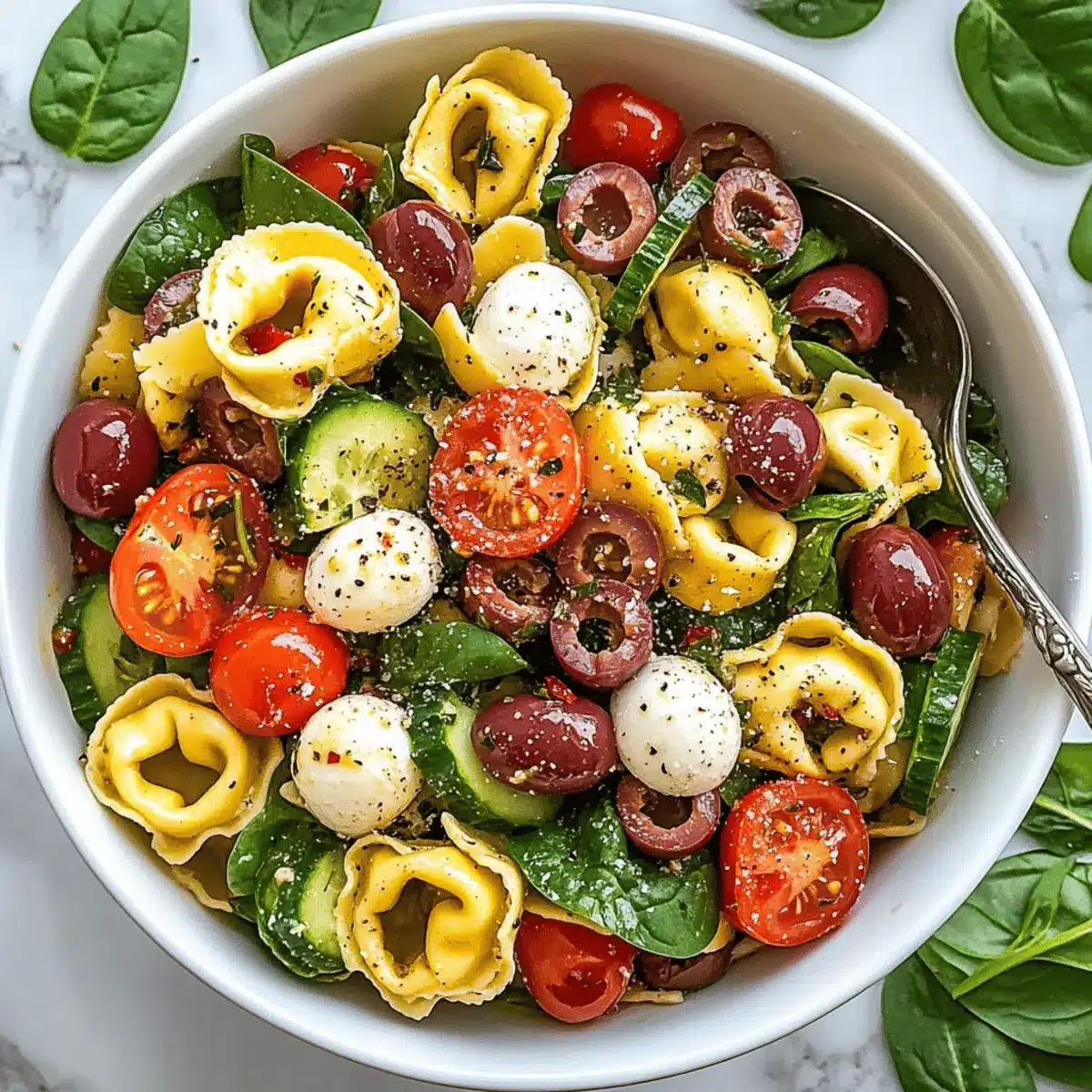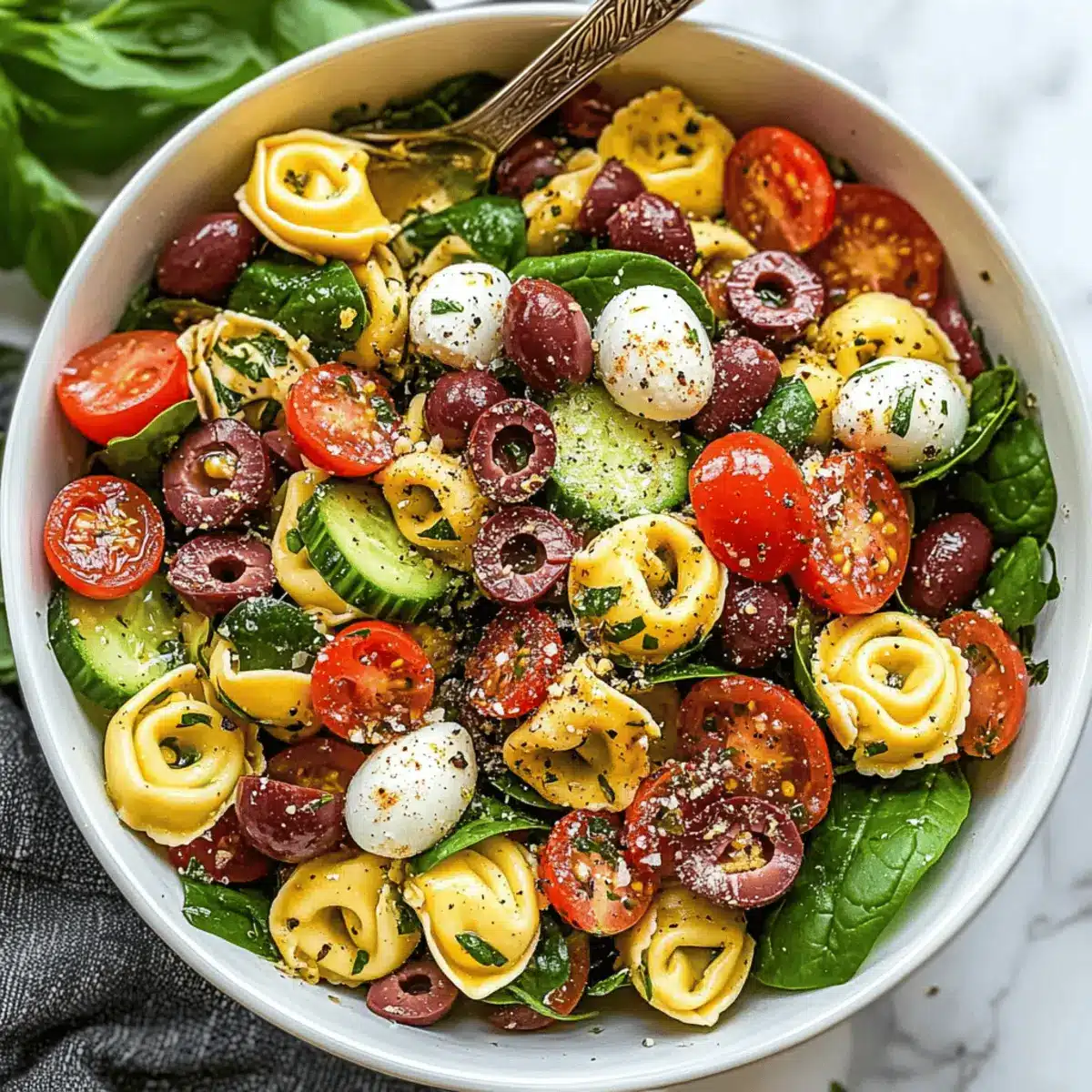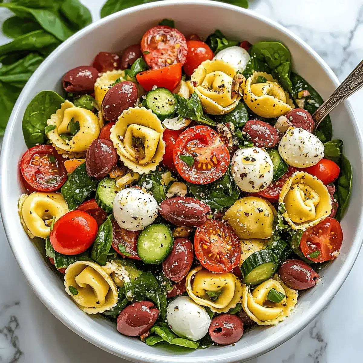 Add the halved cherry tomatoes, diced cucumber, thinly sliced red onion, pitted kalamata olives, fresh mozzarella balls, chopped salami, grated Parmesan cheese, baby spinach, and fresh basil to the bowl with the tortellini. Drizzle the remaining dressing over the top and toss gently until everything is beautifully combined and evenly coated.
