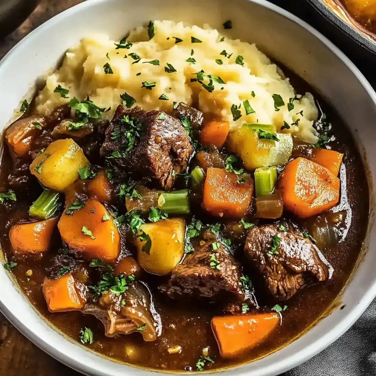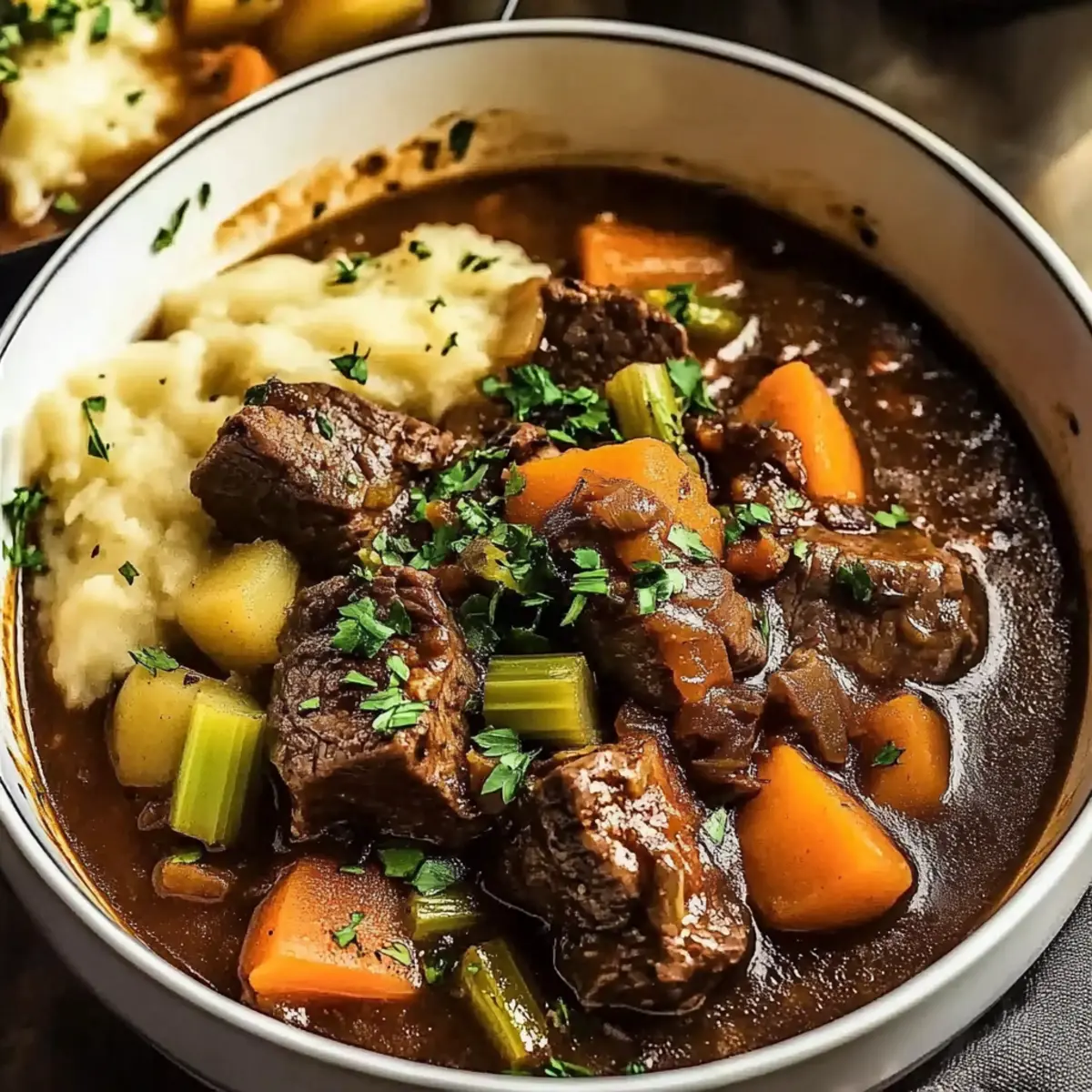 Creamy Mashed Potatoes: Smooth and buttery, these mashed potatoes create a comforting base that elevates the stew, soaking up the flavorful broth.