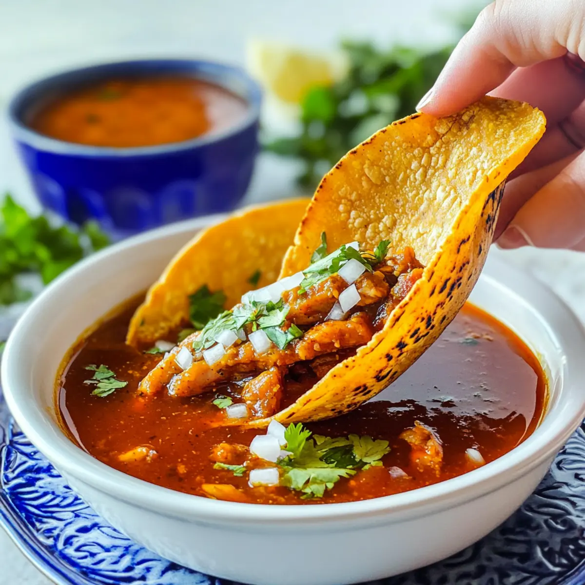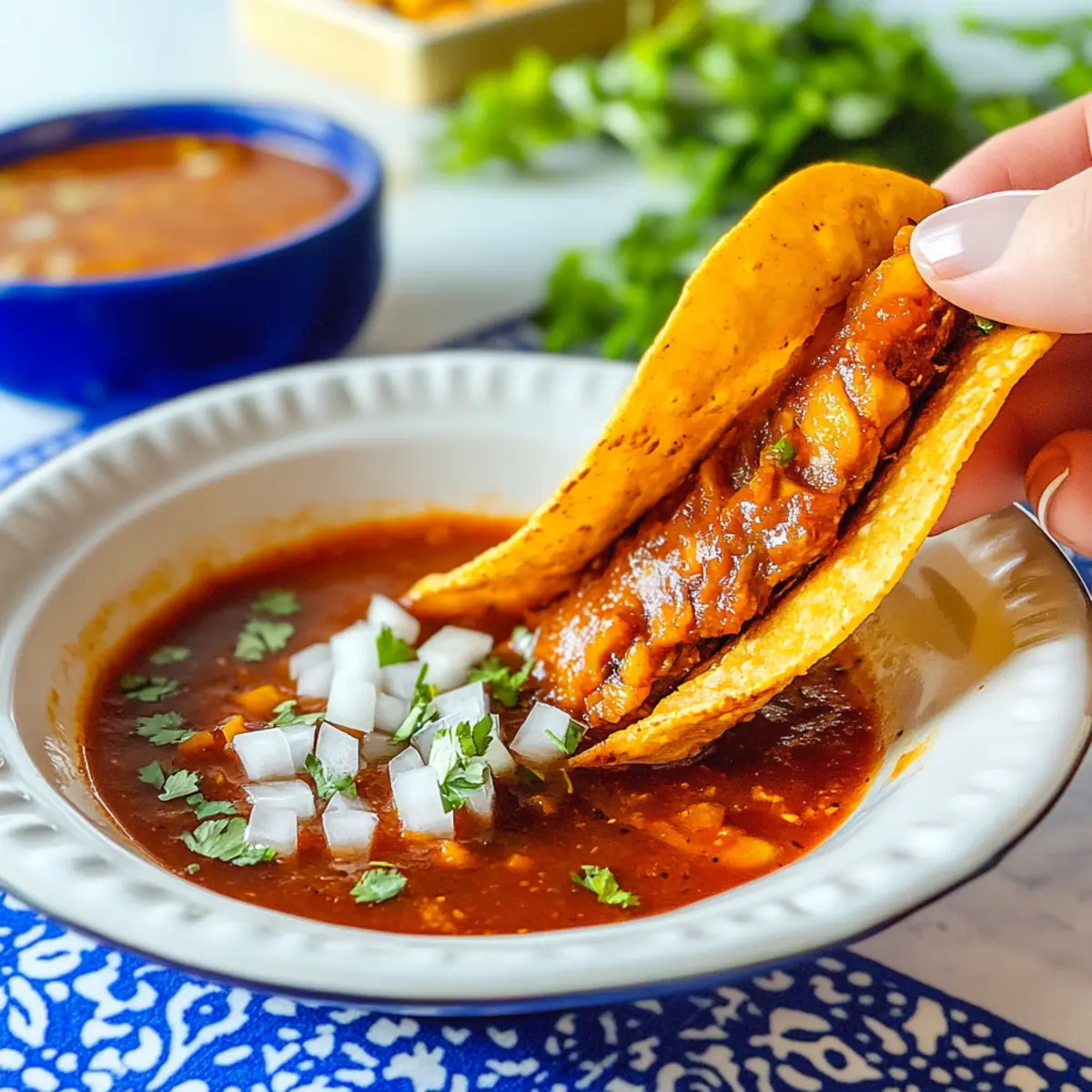 - Serve with warm birria broth for dipping, topped with cilantro, diced onion, and lime wedges.