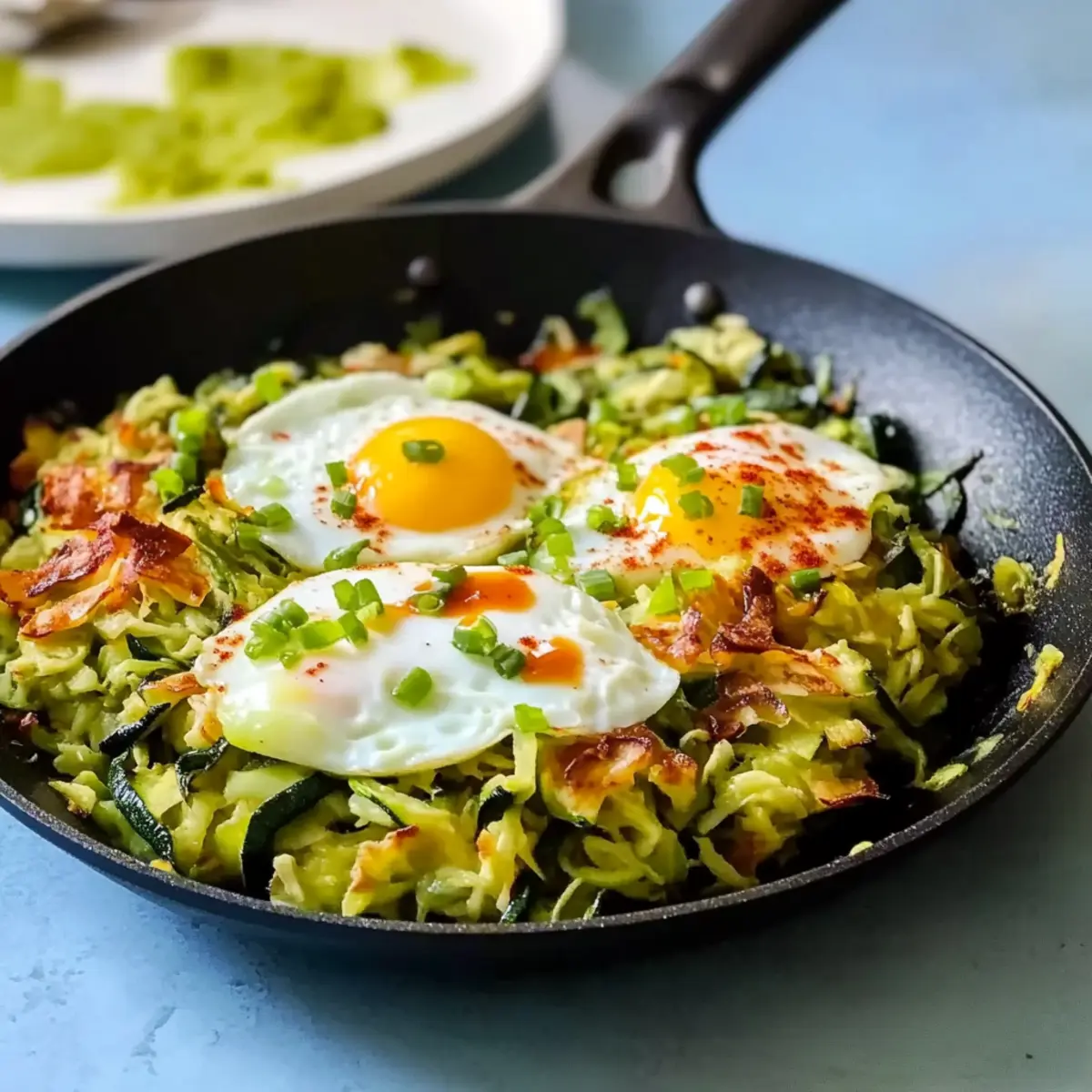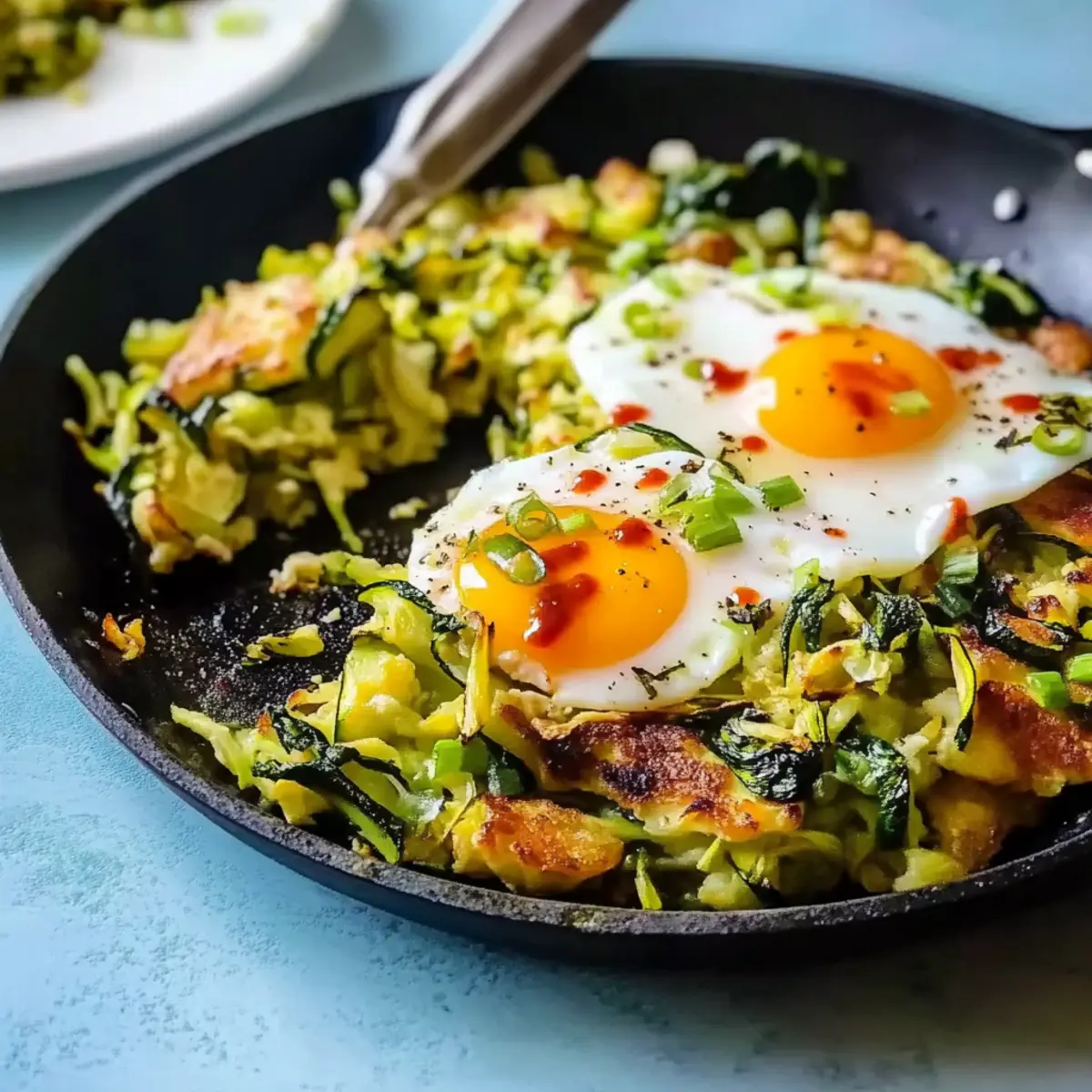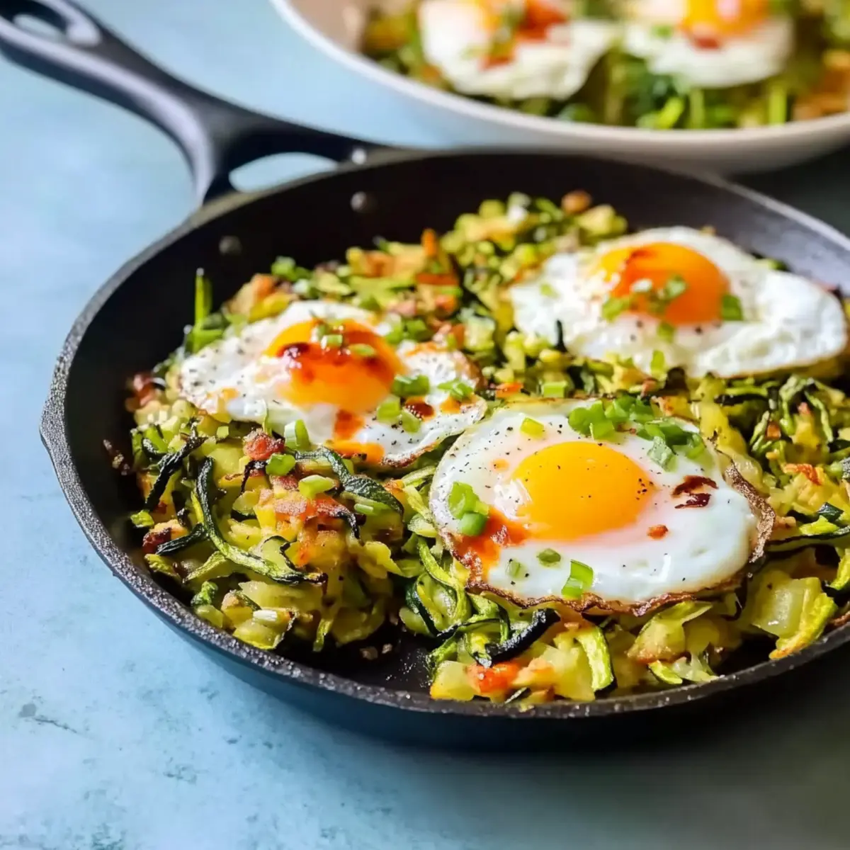 Once the eggs are cooked to your liking, remove the skillet from the heat. Drizzle with your favorite hot sauce for a little kick, and garnish with chopped scallions for bright freshness. Serve your delightful Zucchini Breakfast Skillet hot, enjoying the beautiful blend of flavors and textures that make this dish a morning favorite.